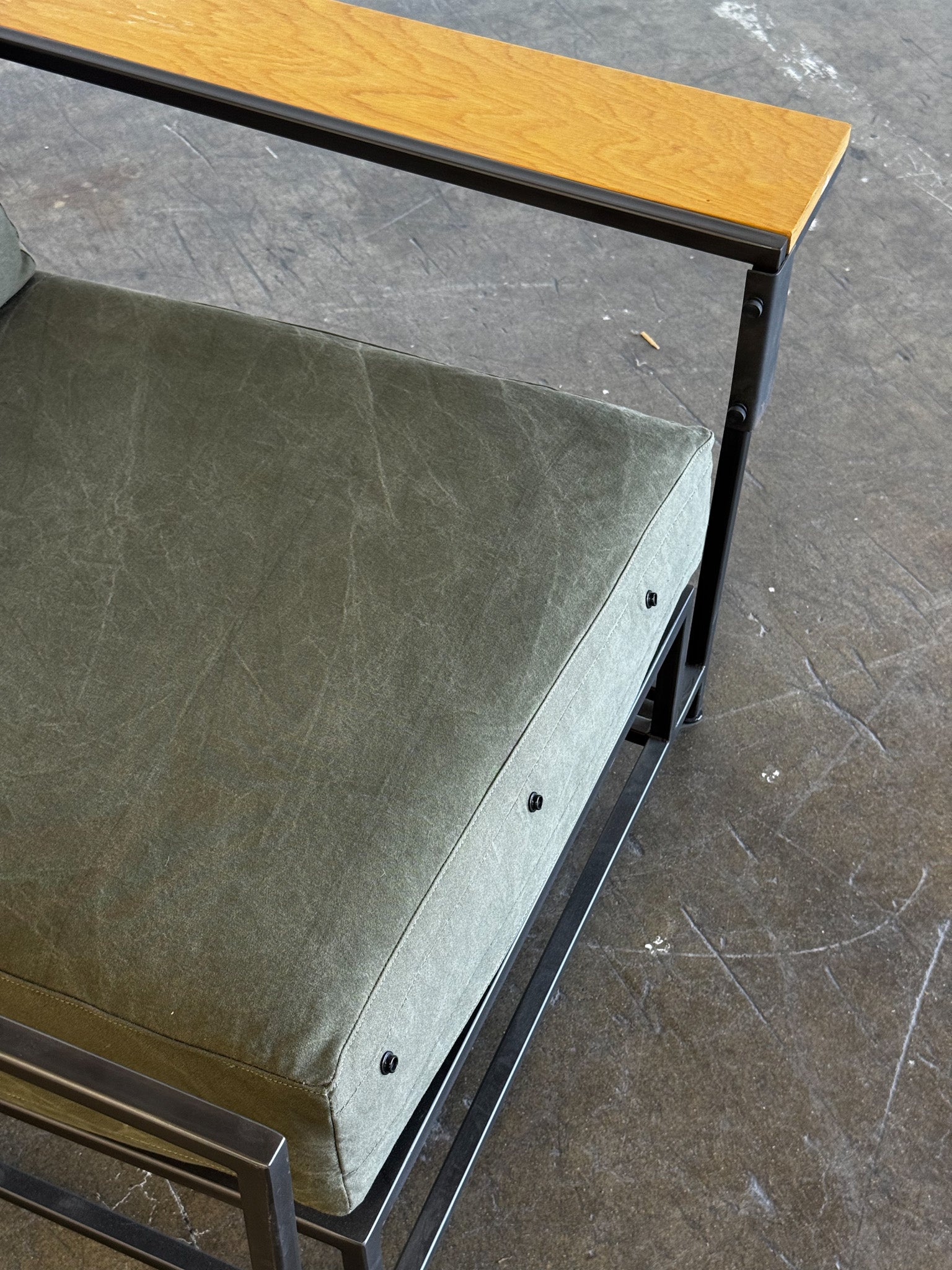 The Military Canvas upholstery set is brand new. The boucle set is lightly used, and the frame is lightly used.