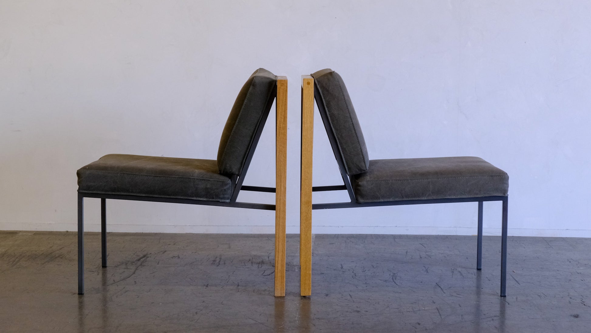 A prototype of a new upholstered dining chair. The material is a heavy dark olive canvas, atop a base frame of blackened steel and a back frame of oak. Optional additional canvas cover can be velcro'd over the top.